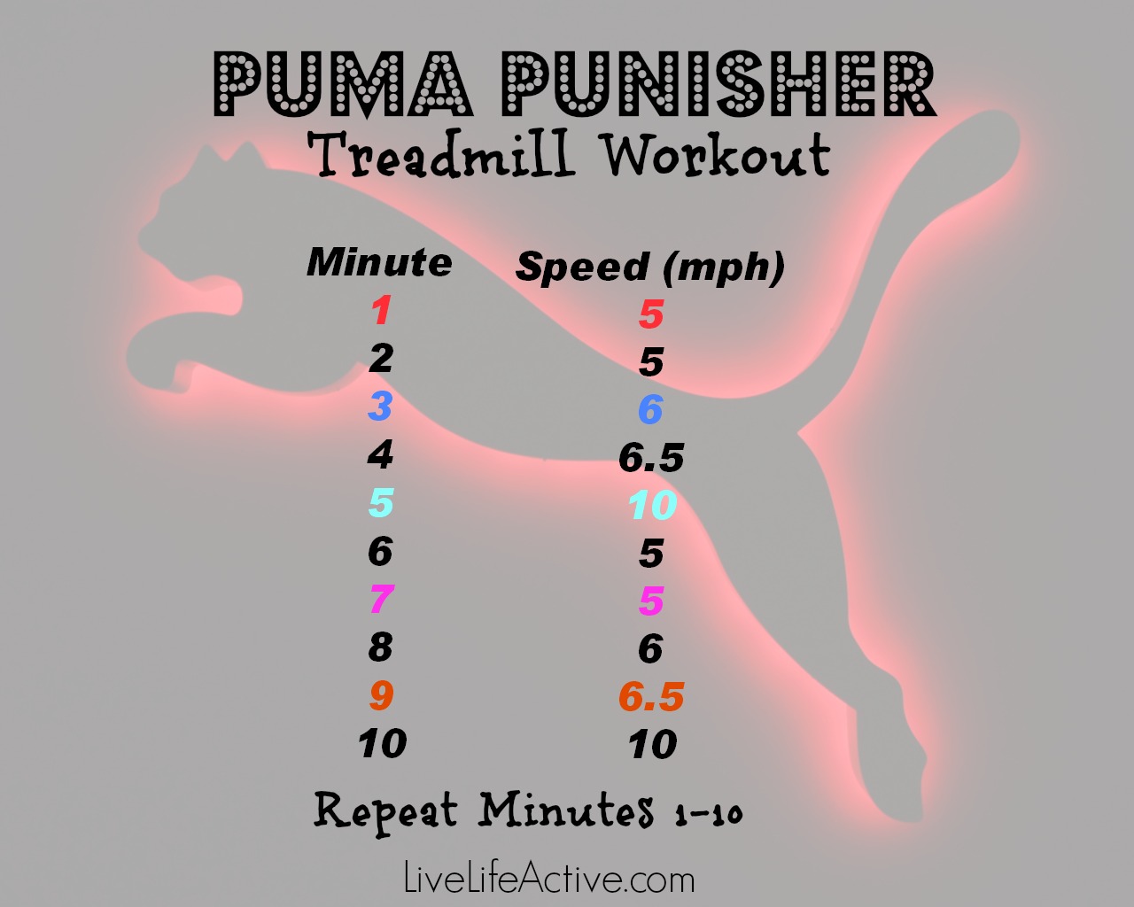 The PUMA PUNISHER is an example, thanks to LiveLifeActive.com for sharing. Personally, I think 10 is too fast and 5 is too slow, so I’ll modify it to fit my running needs (prob 8.0 as max and 6.0 as min).